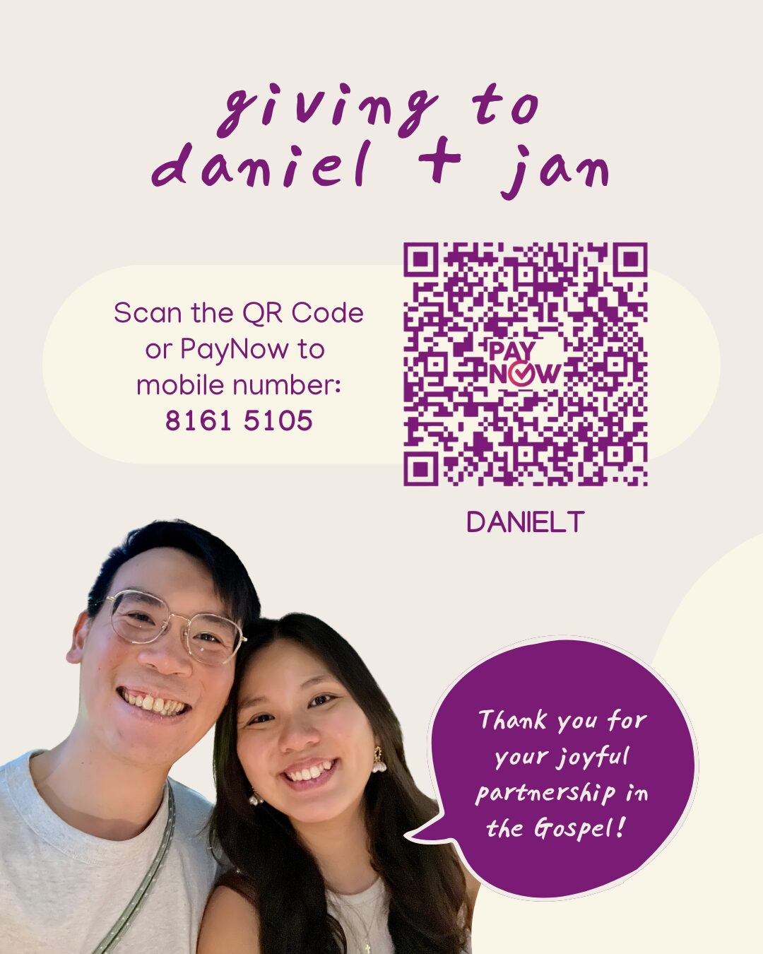 If God moves you to support us financially, you can do so by scanning the QR code below or PayNow to our mobile numbers: